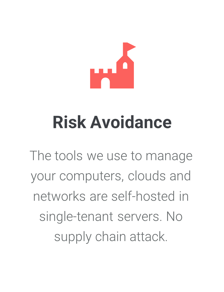 We shield our clients from the vendor lock-in and security risks inherent to using proprietary or niche solutions. Access to your data and infrastructure by third party entities is limited to service providers you trust (e.g.: LOBs, Microsoft 365, Google Workspace...). The work we invest in building your cloud infrastructure remains yours after we leave (it is not tied to our infrastructure). We support PCs, Macs, Linux, and Chrome OS devices. Furthermore, The tools we use to manage and monitor your computers and M365 are self-hosted in single-tenant servers (to insulate you from supply chain and "monoculture" ransomware attacks.) [More]